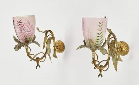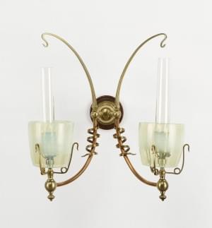 Applique à deux lumières, cuivre, laiton et verre, 65x70 cm. Bib...
