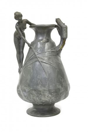 A décor d'une femme nue pêchant dans un étang, étain, H 50 cm