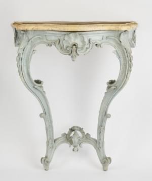 Bois sculpté et laqué bleu, marbre, 85x70x35 cm