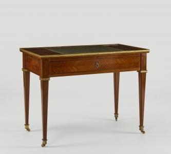 Pieds gaines, marqueterie de bois de rose, maroquin vert et bron...
