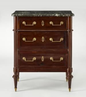 Trois tiroirs, acajou, laiton et marbre, 85x64x41 cm