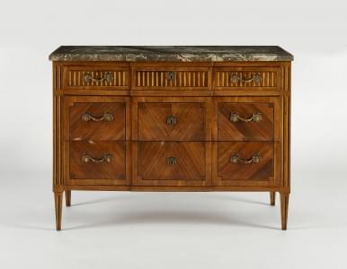 Trois tiroirs, acajou, laiton et marbre, 87x127x60 cm