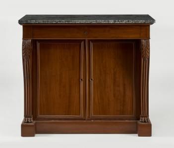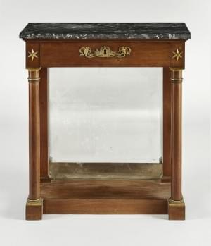 Un tiroir et deux tablettes latérales, acajou et bronze doré, ma...