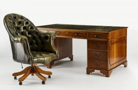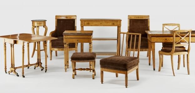 Bois de loupe, comprenant: paire de bergères, console, bureau, a...