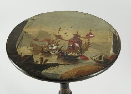 Bois noirci, plateau peint d'une scène avec une gondole aux arme...