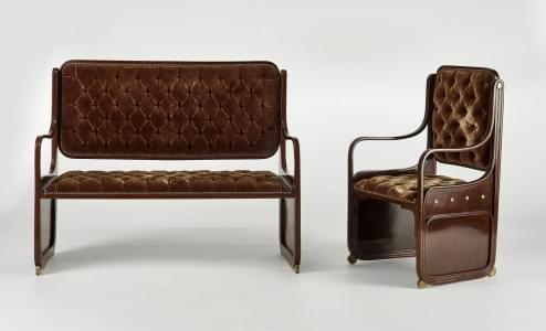 Banquette et un fauteuil, modèle 413, hêtre teinté et velours bo...