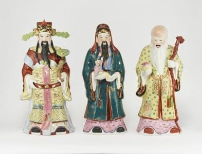 Gouache à décor de guanyins et immortels sur fond rouge et blanc...