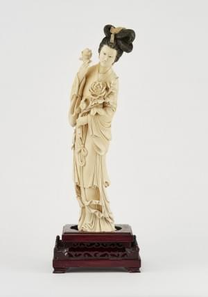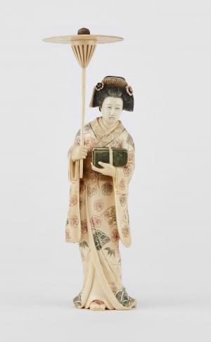 859. Okimono figurant une jeune femme en pied au chignon tenant des r...