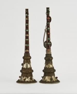 Métal, laiton, bois et cabochons de turquoises et coraux, H 52 e...