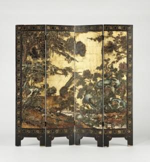 Laque de coromandel à décor d'oiseaux et branches fleuries sur f...