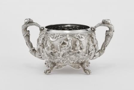 Argent, piètement poissons et à décor de personnages zoomorphes,...