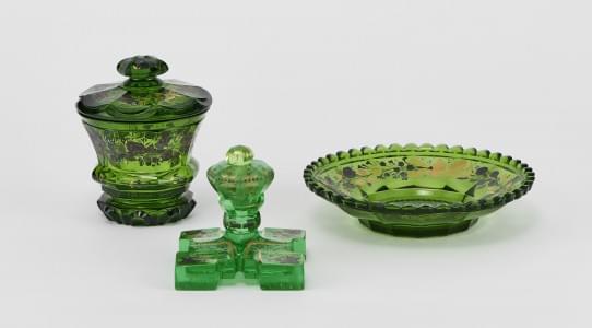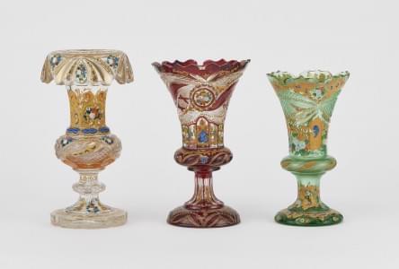 Verre incolore, vert et rouge, émaux polychromes et or, H 21 à 2...
