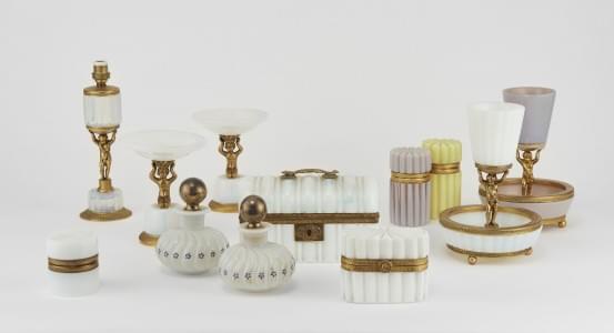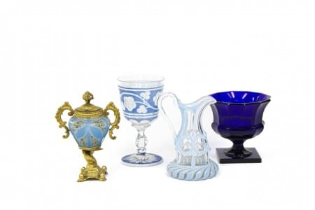 Opaline blanche et rose, verre incolore et bleu, l'un orné du po...