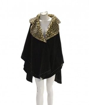 Cachemire noir et col en fourrure façon léopard, bordure ponctué...