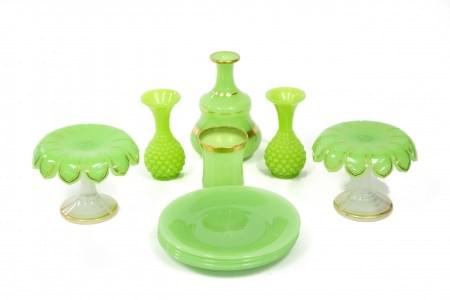 Opaline verte à décor doré de rinceaux, H 14 à 32 cm