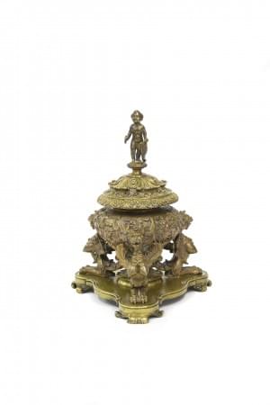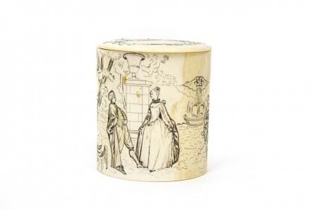 A décor incrusté de bois fruitier, poivre noirci, laiton et ivo...