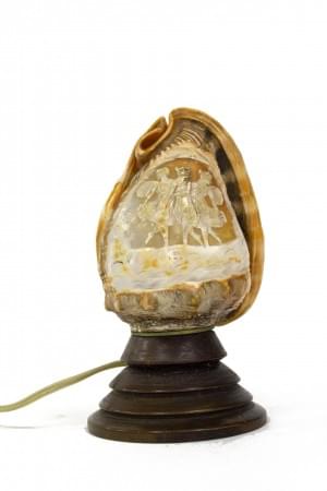 Coquillage gravé façon camée et monté en veilleuse, H 15 cm