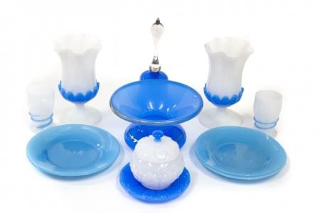 4106. Paire de soliflores, paire de présentoirs, 4 assiettes, 1 carafe...