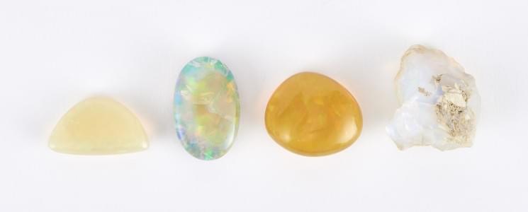 Lots de quatre opales sur papier, trois polies (7,4 ct, 16,6 ct...