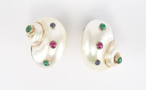 3224. Boucles d'oreilles à motif de coquillages sertis de rubis, saphi...