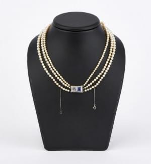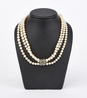 3251. Collier de perles trois rangs, terminé par un fermoir serti de p...