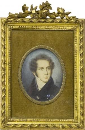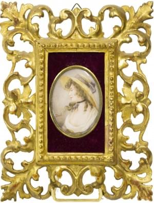Miniature ovale dans un cadre rococo, figurant une femme au chap...