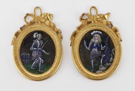Paire de miniatures, Limoges, XVIIe s, émail sur cuivre, cadres...