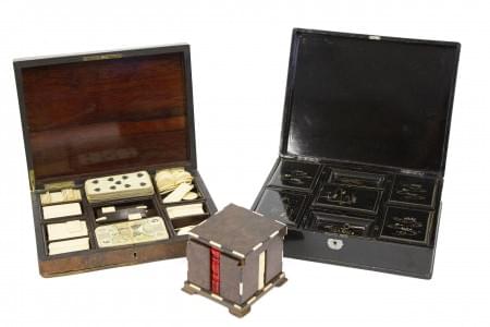 Une en bois marqueté et l'autre en bois laqué, jetons en résine...