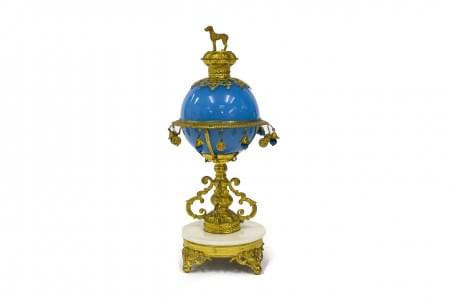 Métal doré, verre bleu et marbre blanc, H 26 cm
