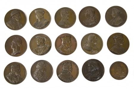 3411. Suite de 14 médailles, rois de France et Marianne en bronze