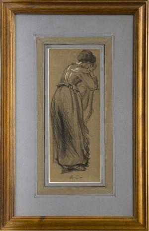 Jeune femmes au couffin, fusain sur papier signé, 46x30 cm