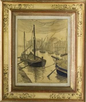 Bâteaux dans le port, lavis d'encre sur papier, signature non id...