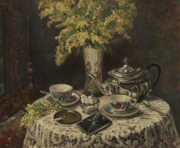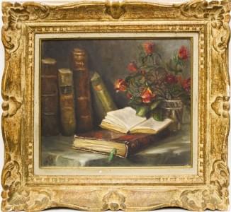 Nature morte aux livres et vase de fleurs, huile sur toile, mono...