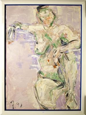 Nu féminin assis, huile et acrylique sur toile, datée 91, 92x65...