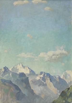 Paysage avec montagnes, huile sur pavatex, signature illisible,...