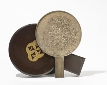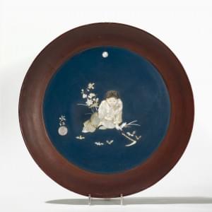 Laque à décor incrusté de nacre, ivoire Japon, signé, D 54,5 cm