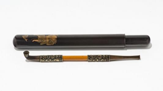 Laque noire et or à décor d'un pêcheur, pipe à décor des signes...