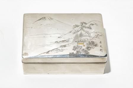 Argent, le couvercle à décor incisé du mont Fujiyama , signée, J...