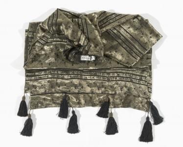 Longue étole en soie brochée dorée et noire agrémentée de pompon...