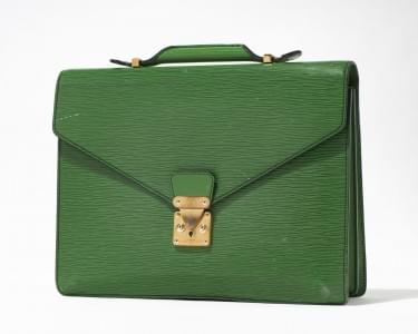 Cuir épi vert, intérieur en cuir noir, deux soufflets, fermeture...