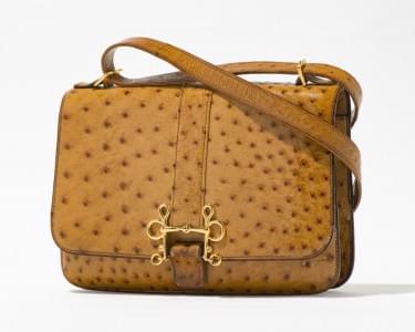 Cuir d'autruche brun, fermoir à languette, attributs en métal do...