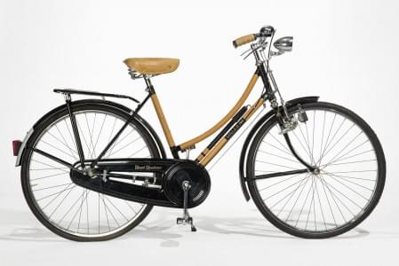 Vélo pour femme gainé en cuir grainé caramel, piqûres sellier bl...
