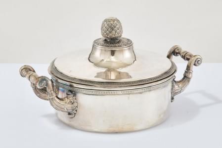 404. Drageoir d'époque Restauration à pieds griffes et anses en enrou...