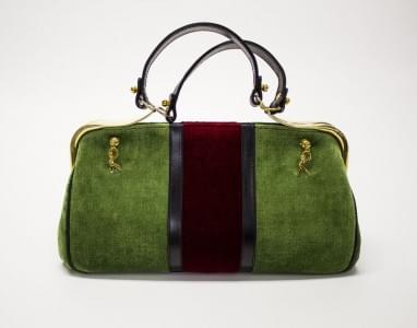 Velours vert et rouge, intérieur et anses en cuir noir, fermoir...