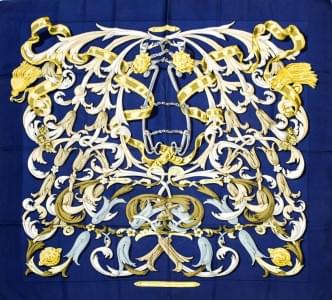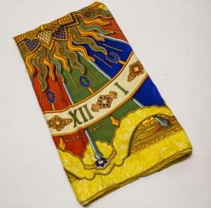 Foulard à décor de cadran solaire sur fond doré, soie, 86x86 cm
