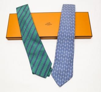 Lot de deux cravates en soie à décors géométriques et à fonds bl...