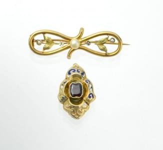 3090. Lot de deux broches anciennes, l'une émaillée bleue sertie d'un...