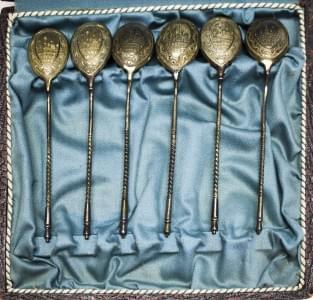 3310. 6 cuillères à thé à manche torsadé et décor de villes russes
