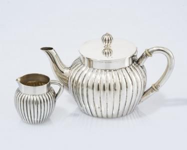 3357. Verseuse piriforme tripode gravée de lambrequins, crémier à larg...
