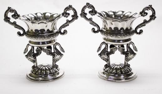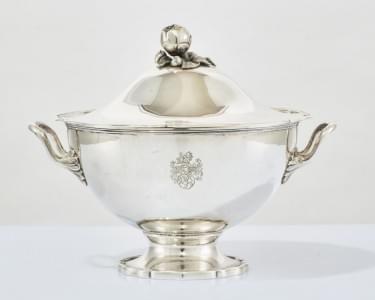 3328. Drageoir néoclassique à anses dauphin, frises de feuilles d'eau...